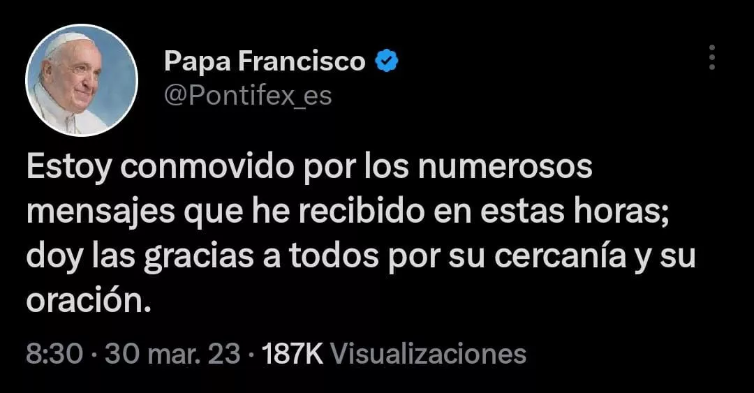 “Estoy conmovido por los numerosos mensajes que he recibido en estas horas; doy las gracias a todos por su cercanía y su oración”, escribió Francisco en su cuenta de twitter.
